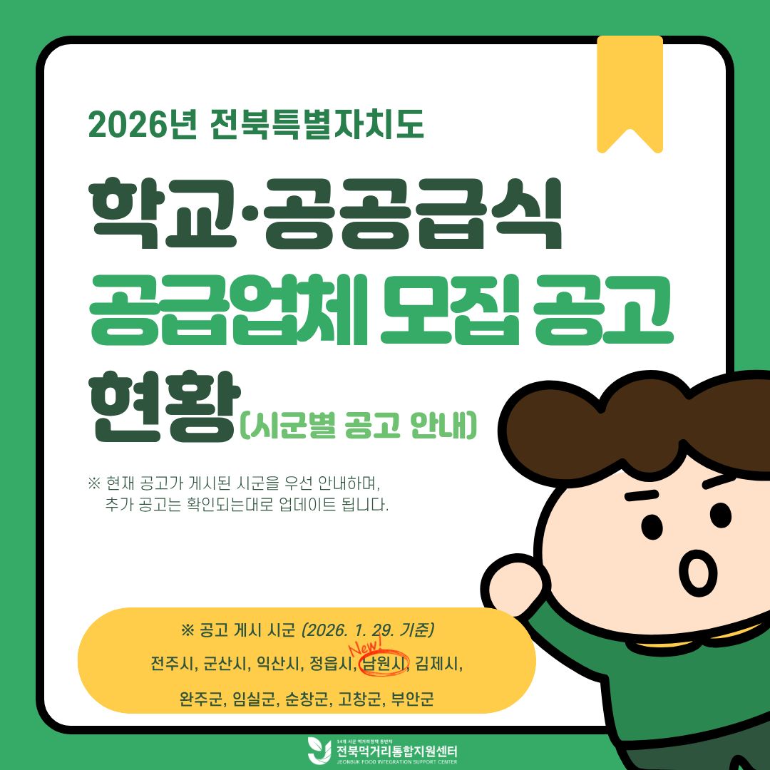 지역 먹거리의 내일을 함께 만들어가는전북특별자치도 14개 시군의 행정부서와 먹거리지원센터를 소개합니다.